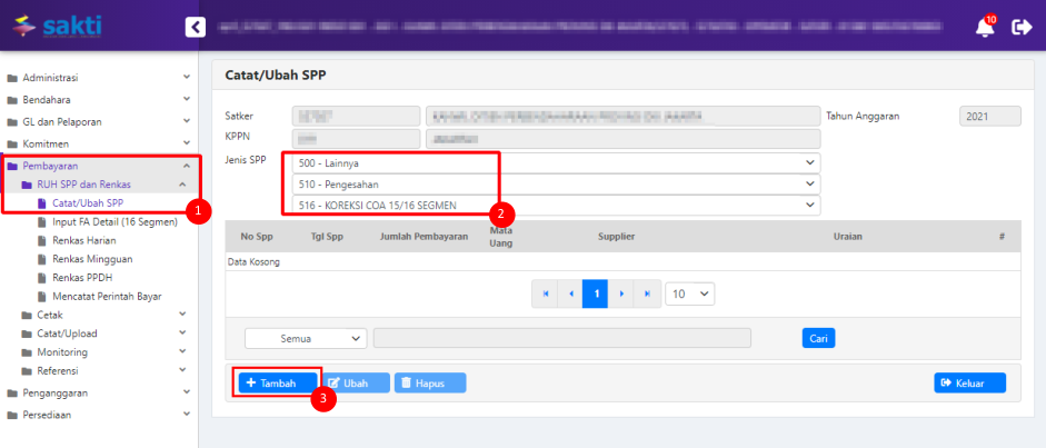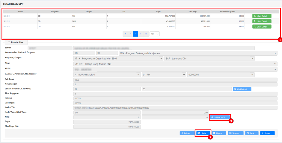 Setelah itu akan muncul halaman perekaman (Catat/Ubah) SPP, namun hanya Distribusi COA yang bisa