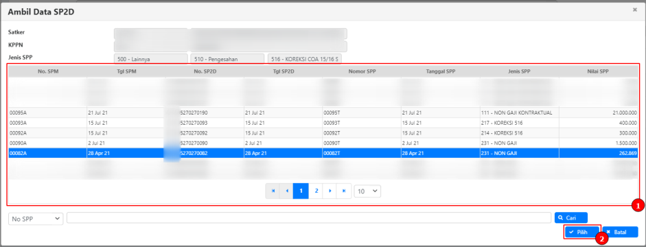 Pilih SP2D yang akan dibuatkan koreksi. SPP yang belum memiliki nomor SP2D tidak akan muncul