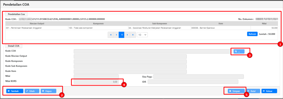 - Klik tombol “Simpan” untuk menyimpan perekaman pendetailan segmen COA 15/16 atas akun
