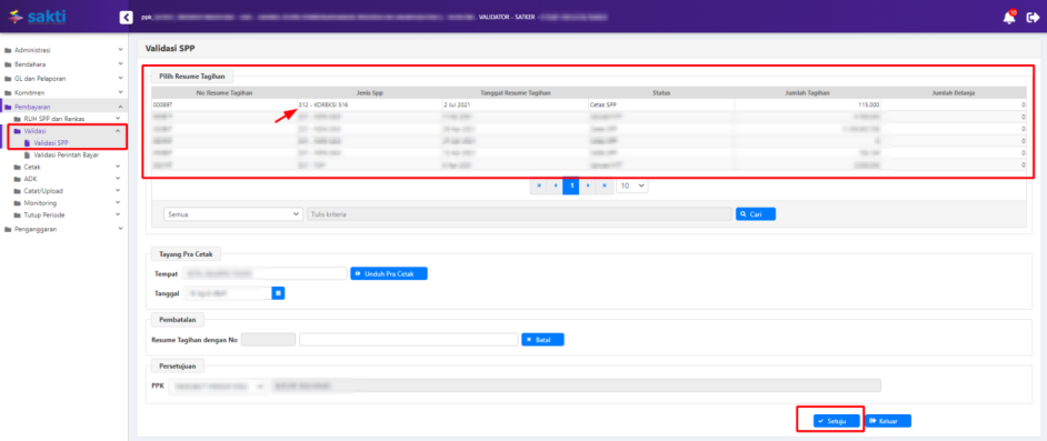 - Pilih SPP yang ingin divalidasi.