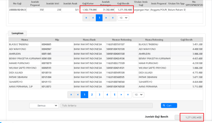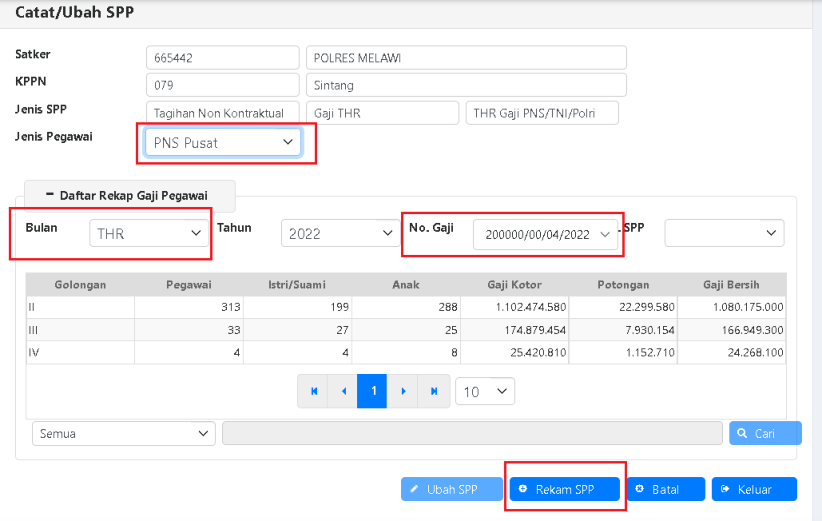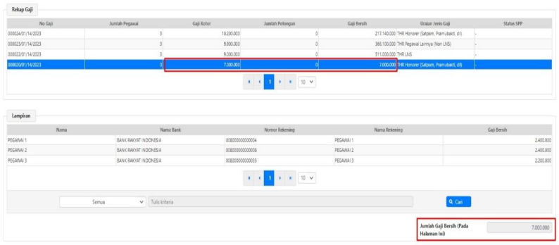 b. Pastikan Jumlah Gaji Kotor, Potongan, Gaji Bersih sudah sesuai dengan Rekap Gaji dan Lampiran.