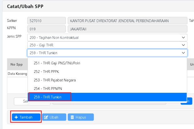 a. Pilih Jenis SPP 259 – THR Tukin