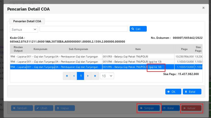 b. Klik pencarian COA, pilih COA, simpan dan keluar