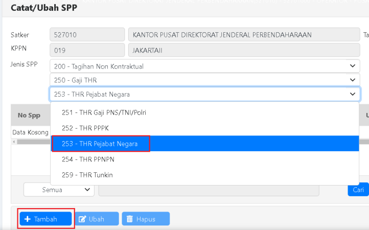 a. Pilih Jenis SPP 253 – THR Pejabat Negara