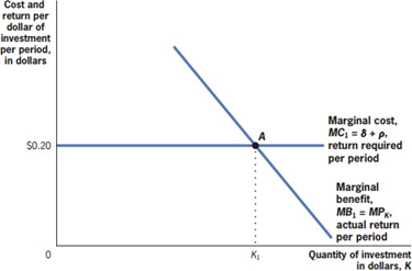 - Biaya marjinal (MC) adalah sama dengan pengembalian yang diperlukan per dolar investasi, yaitu jumlah penyusutan (Ξ΄) dan biaya pembiayaan (Ο). Kesetaraan ini awalnya terjadi pada titik A, dengan tingkat investasi K1.