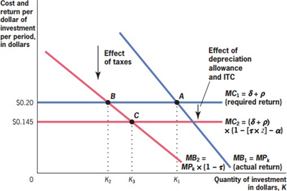 - Perusahaan pun berpindah ke titik C, dengan tingkat investasi sebesar K3,Β lebih tinggi dibandingkan kondisi sebelum ada depresiasi dan kredit pajak investasi, namun tetap lebih rendah dibandingkan saat kondisi tidak adanya pajak.