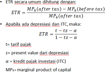 2. Tingkat ETR ini bisa jadi negatif apabila investasi bisa didepresiasi secara penuh dan ada kredit pajak penuh terhadap investasi (nilai z dan Ξ± besar).
